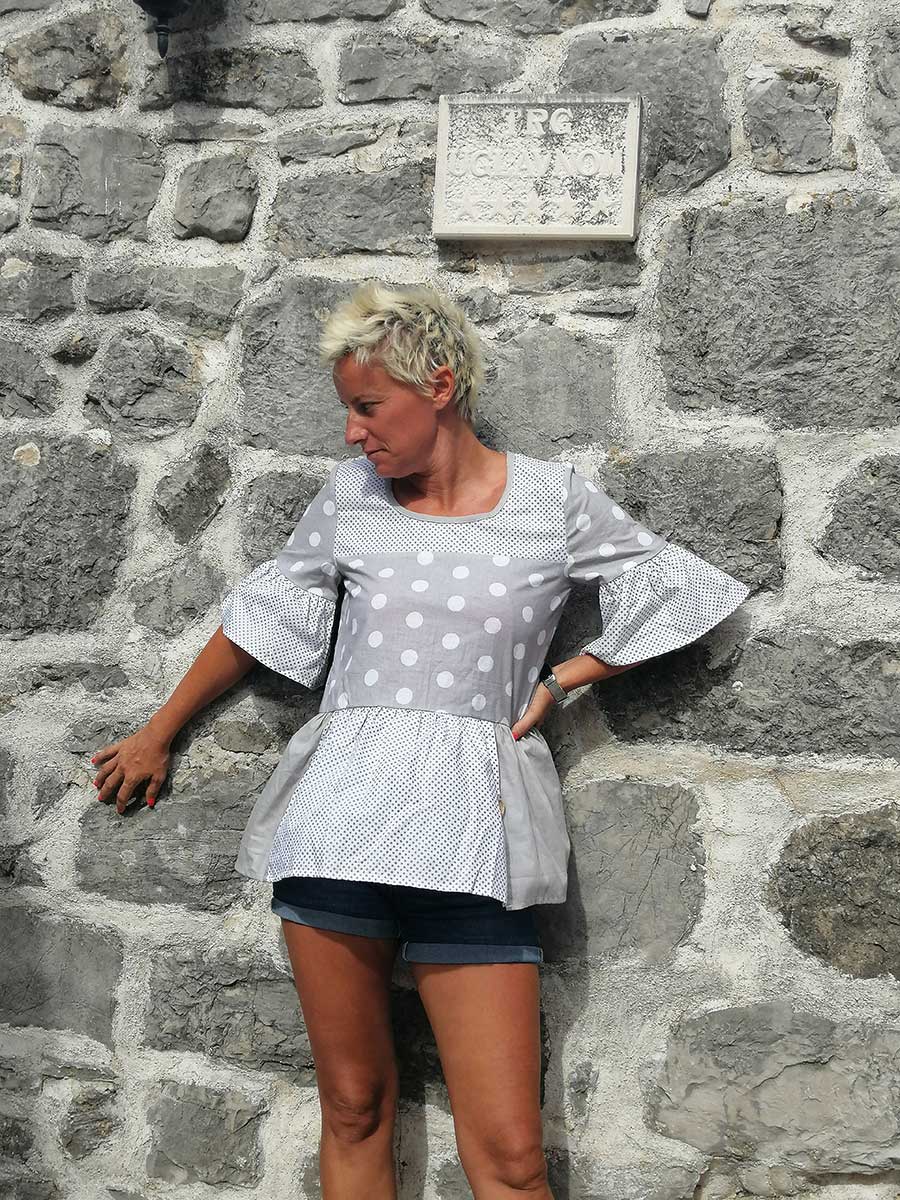 Siva patchwork košulja na točkice, ljetna pamučna košulja s volančićima
